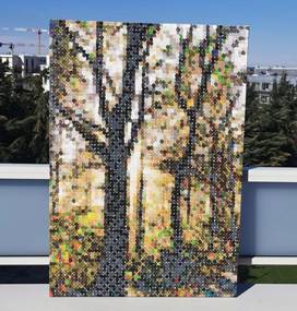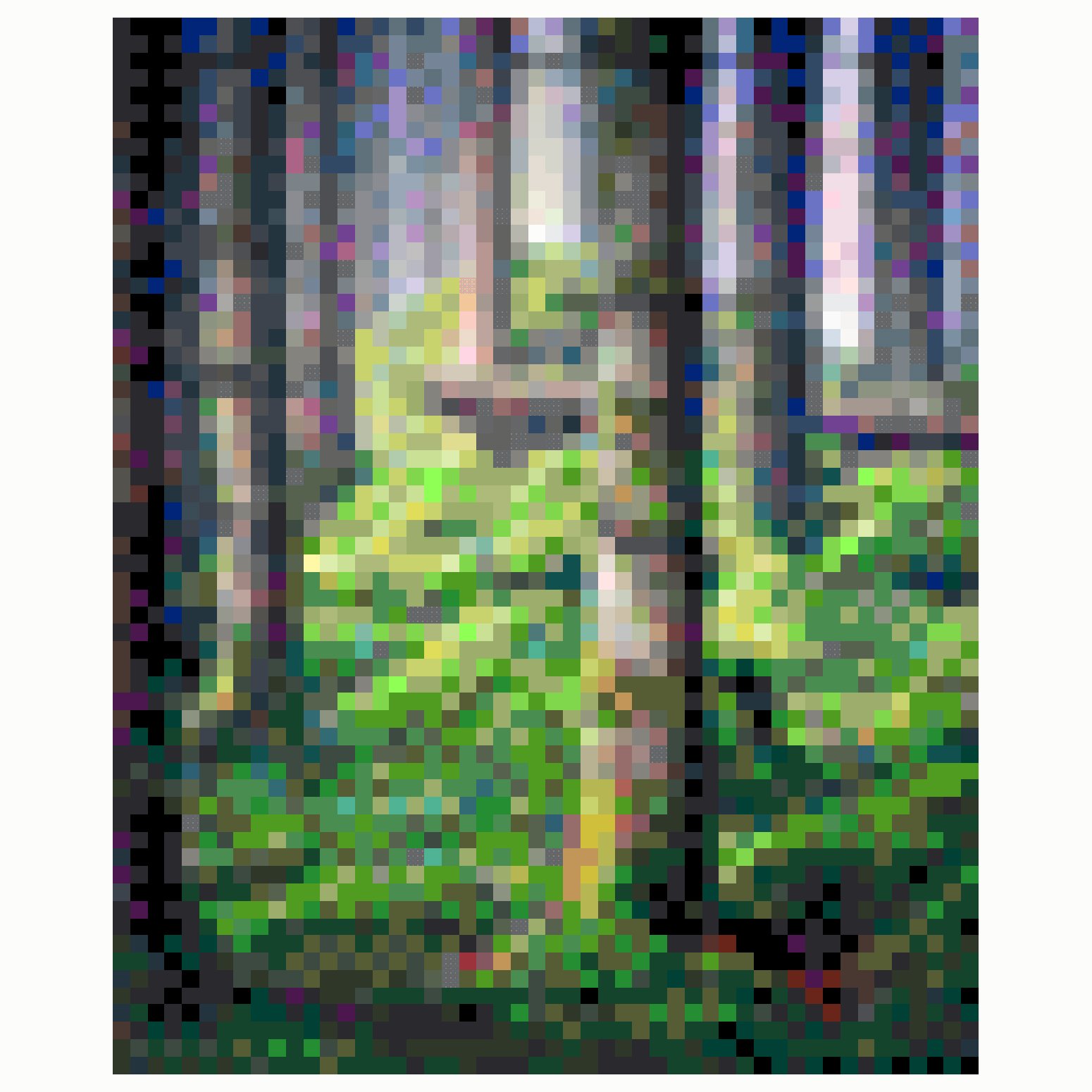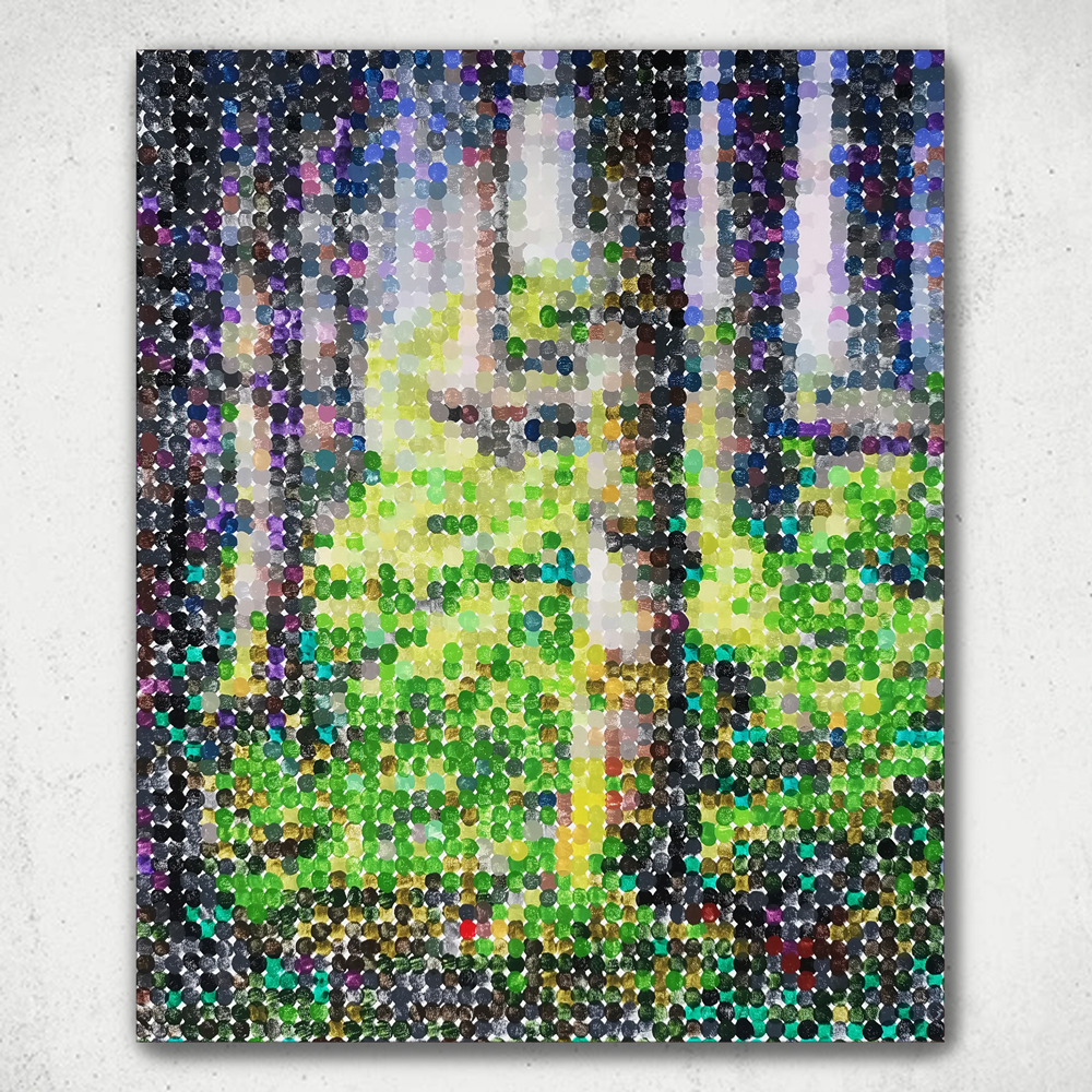 Dans le virtuel le sujet de l’œuvre est respecter, les couleurs aussi, mais elle est dans sa « propreté » du pixel ou chaque carrée est parfait et d’une seul couleur.